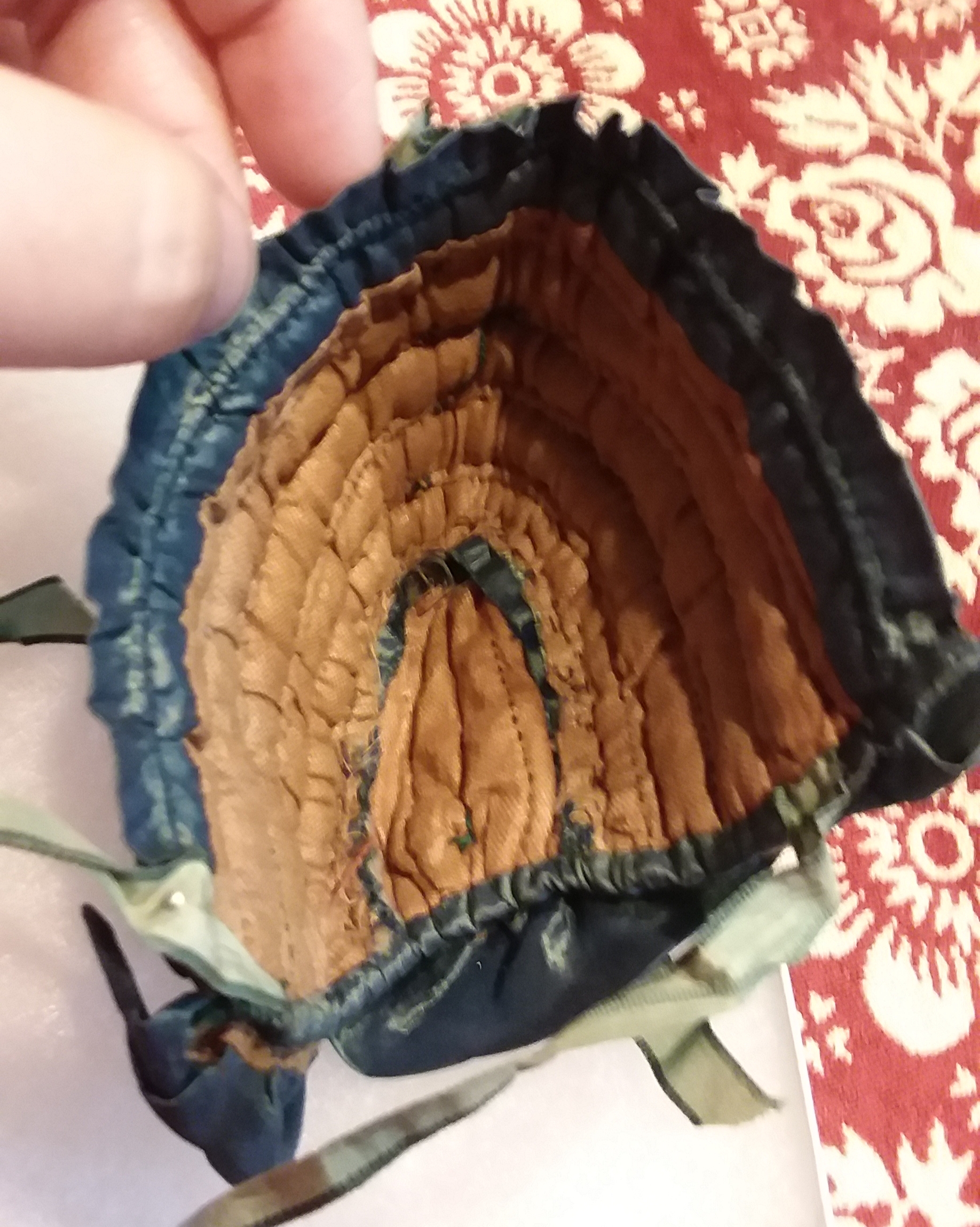 The exterior fabric is most frequently silk taffeta. The smooth, tight weave helps with moisture control. Dark solid silks out number the plaids and lighter colors, which were also used. The linings tend to be polished cotton or cotton sateen in neutral browns and creams. Most pieces have a facing of the exterior silk.