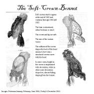 Soft Crown Bonnet – A bonnet with a firm brim of buckram, net, or straw and a crown of soft materials. This usually includes layering of net and silk with the possible addition of lace. (Soft crown bonnets are comfortable and suit a wide range of head shapes.) Examples: Godey’s 1861: Lower right Figure 4 (description),