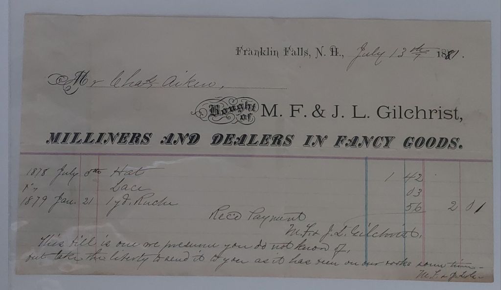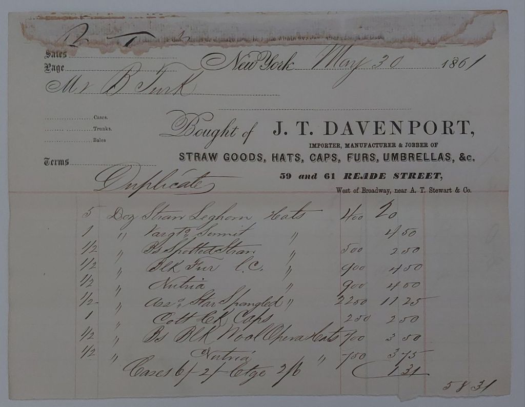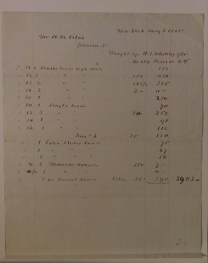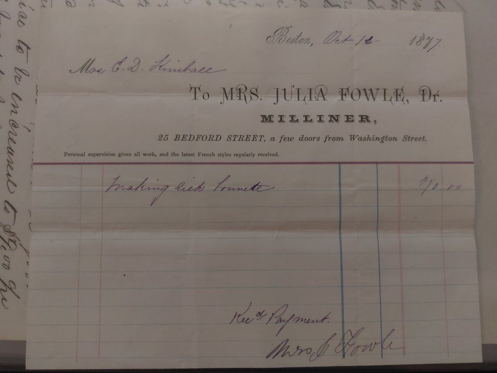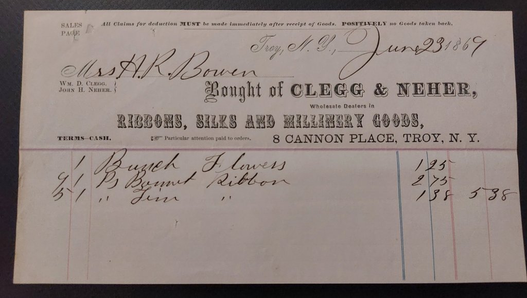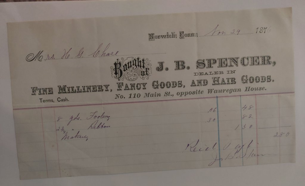 Millinery Bill of Sale – Fowle, Boston MA. 1877.Millinery Bill of Sale – New York, 1845.Millinery Bill of Sale – Wilcox & Clark, Springfield. 1849. Millinery Bill of Sale Francis Ellis, Boston, May 1852.Millinery Bill of Sale, Davenport, Boston, May 1861.Millinery Bill of Sale Davenport, New York, July 1861.Millinery Bill of Sale Davenport, Boston, November 1861.Millinery Bill of Sale, Keith, Faxon, & Co., Chicago, October 1864.Millinery Bill of Sale Wood & Clark, Philadelphia, June 1865.Millinery Bill of Sale – Clegg & Neher, Troy, NY. 1869. Millinery Bill of Sale – Clegg & Neher, Troy, NY. 1869.Millinery Bill of Sale – to Mrs. Chase. Hewes, Chicago IL. 1875.Millinery Bill of Sale – to Mrs. Chase. Henderson, New London, Conn. 187?.Millinery Bill of Sale – to Mrs. Chase. Henderson, New London, Conn. 1876. Millinery Bill of Sale – to Mrs. Chase. Spencer, Norwich, Conn. 1876.Letter Re: Millinery Goods, Clark Brothers, New York, May 1881.Millinery Bill of Sale Gilchrest, Franklin Falls, NH 1881.Millinery Bill of Sale – Maloney, Philadelphia, PA. 1890.