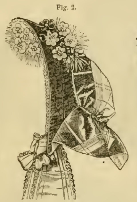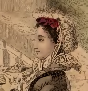 Cuir-colored silk bonnet, with a cape of white crepe covered with rich blonde. The trimming is place on top of the bonnet, and is formed of bands of Solferino velvet and feathers. The inside trimming is tulle and Solferino flowers. (Godey’s, October, 1864)