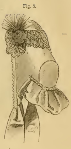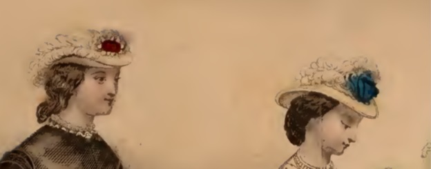 Some of the dress hats have a brim entirely covered with velvet. The principal timmings for ladies and misses are feathers and velvet. All kinds of feathers are brought to requisition – peacock’s, heron, king fisher’s, cock’s, and even eagle plumes.
