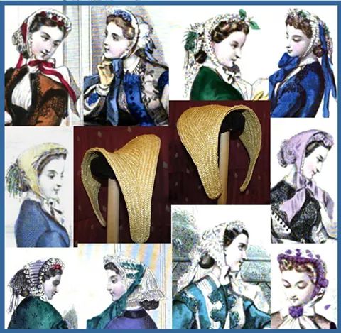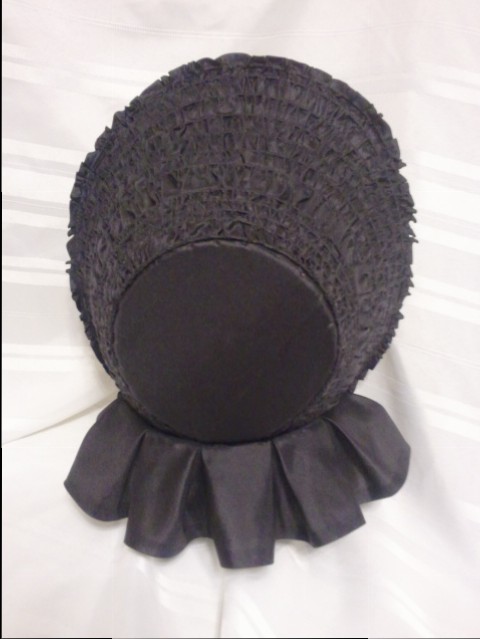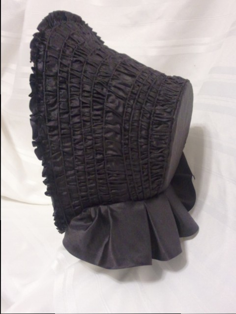 All the measurements are as exact as I could get. I kept with the original seam construction as well, right down to the use of salvage which I’ve come to love for its great reduction in bulk. I did make two additional changes besides the color. The original has a piece of half inch broken cane. As it is only a fragment and the pinholes that previously held it only showing in a small area, I could not determine exactly where it ran. I have not included that. There is a piece of black ribbon attached flat along the bavolet seam on the outside that is just off. I suspect it was either added later to cover pinholes from where a decorative ribbon was placed or to cover wear. (Here is the Etsy link.)