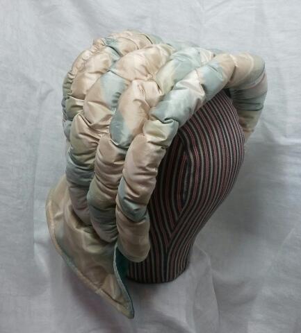 Back to the exterior, you’ll see an interesting combination of quilting. All the quilting is made of diagonal stripes spaced at 1.25″. But, the front of the brim and where it turns under to the inside the quilting makes diamonds, while the mid to back section of the brim is simply diagonal stripes. I happen to really like the way the look comes together. The bavolet and tip both have the full diamonds. (I can tell you, this is a lot of quilting.)