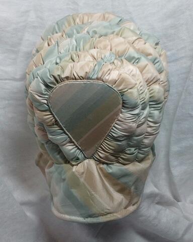 Now, I’m sure you are wondering why I’m calling this “The Ultimate Winter Wind Hood.” When I finished it and tried it on, I was greatly impressed by how wind resistant this hood is. The brim comes very forward of the face. At the same time, the ribbons inside the brim draw the interior of the hood down around the head, holding it snuggly and comfortably in place. The photo to the left an show you sort-of how those ribbons draw the interior down.