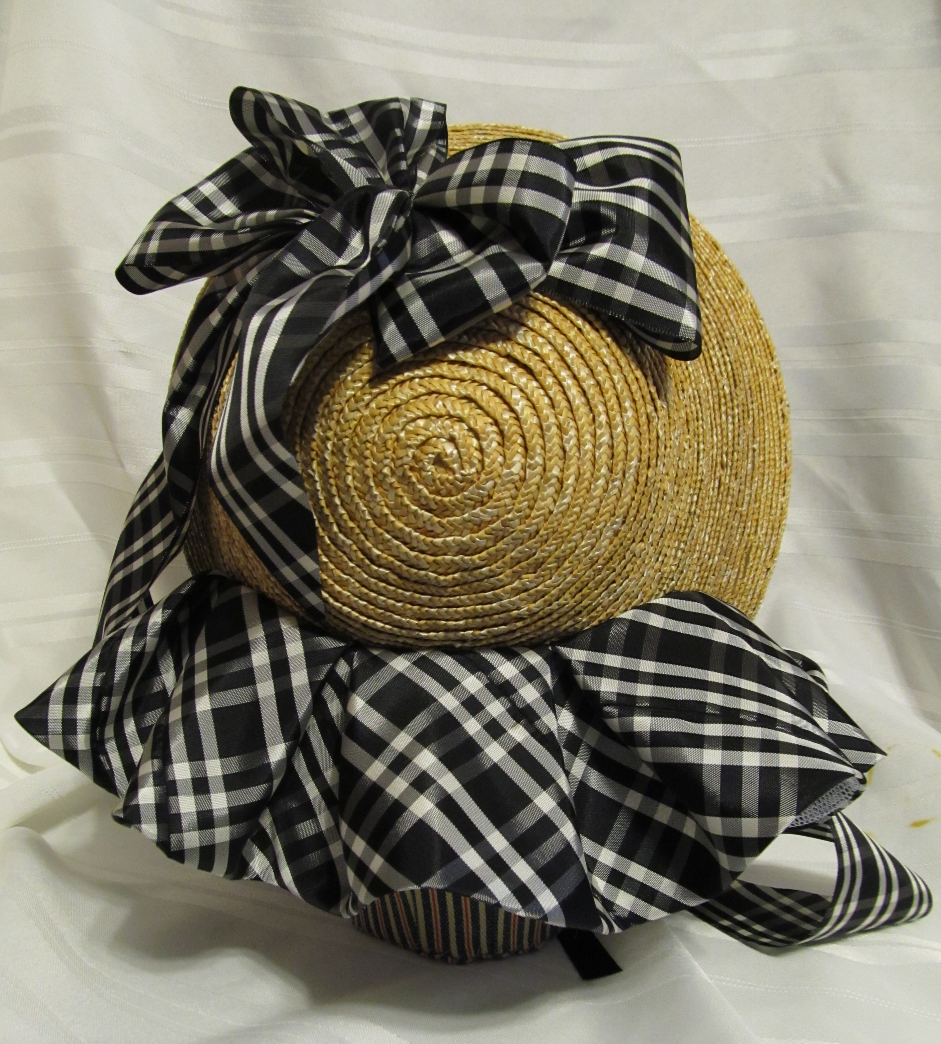 Atop the brim, in the Marie Stuart dip is a cluster of purple flowers and a bow of the same ribbon as the ties, just in a narrower width.