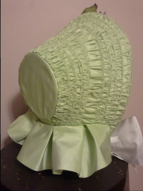 I played with the shaping of the buckram form to get the brim to flare up into a high fashionable shape. This is a shape that will want a bonnet stay. (Yes, I will get to taking some photos of stays asap.)