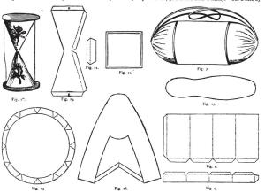 The Hour-Glass (fig 18) – This may be made in two ways. First cut four pieces like fig 19, cutting off the dotted piece at the side (not at the top). Cover each piece with white satin; sew them together. Cut two rounds, much larger, of card; cover each with brown satin. Sew on by the pieces marked A and B, fig 19, which are to be turned down. They should have been half-cut through before sewing. Take two pieces of wire, bind coloured ribbon round them, and sew them to the hour-glass. Cut a piece of card like fig 11; half-cut through the dotted line; stitch it to the top; cover the top with satin. This completes the whole of it. The second and simpler way is to cut the hour-glass like fig 19, half-cutting through the dotted lines, and by the side pieces; gum them neatly together. On the sides draw flowers in water-colours, or paste on spangles.