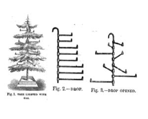 “The Christmas-Tree may be made at home for a very trifling cost. Long as they have been in fashion in England for juvenile parties, of for Christmas-eve, these trees seem to be still in favour almost as much as ever. Christmas-trees may be covered with paltry trifles, or made the medium of dispensing suitable gifts amongst the members of a household. When the latter plan is to be adopted, each article is to be marked with the names of the intended recipient. It is also very well to add a few boxes of sugar-plums and valueless trifles, which can afterwards be raffled for. The ordinary Christmas-tree is covered with miscellaneous articles, some of more value than others, which are either distributed at hazard by the lady deputed to cut them down, or lots are drawn out of a bag of numbers corresponding to those fixed on the little presents themselves. A good-sized fir-tree, of regular shape, and with nice wide-spreading arms, is wanted. Cover this at regular intervals with gelatin lights, which are better and safer than wax tapers. These lights are like ordinary night-lights, each on contained in a little cup of gay-coloured gelatin, resembling the glass lamps used at illuminations when gas is not employed. Take care to place these lights so that not one of them is put under a bough, which may set alight. Suspend them by fine wire, not cotton or string, which will take fire. A little beyond every light arrange a bright tin reflector, star, or silvered glass ball. A number of flags are requisite to add to the gaiety of the tree, which a few bows of coloured ribbon will also emhance.